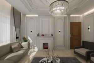The statement ceiling medallion paired with a crystal chandelier establishes grandeur at first glance, while the wall panel mouldings create depth and architectural rhythm. Soft neutral tones enhance the elegance of the space, allowing textures and detailing to take center stage. The carefully curated furniture — featuring plush seating in balanced earthy shades — complements the sophisticated palette without overpowering it.