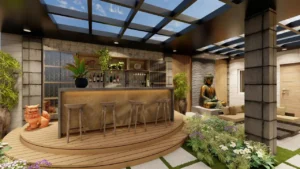 The extended cantilever roof creates a bold contemporary profile while providing functional shade and protection. A pergola-style ceiling detail enhances natural light flow, casting dynamic shadows that evolve throughout the day. The wooden deck and built-in bar counter introduce warmth against the textured stone and concrete finishes, balancing modern minimalism with natural elements.